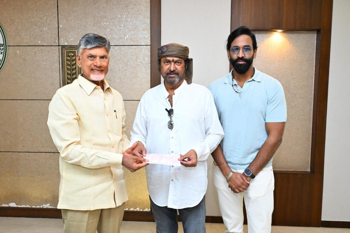 Dialogue King Dr. Mohan Babu Garu and his son Vishnu Manchu recently demonstrated their commitment to social responsibility by presenting a cheque of ₹25 lakh to Andhra Pradesh Chief Minister N.Chandrababu Naidu in support of the flood relief efforts. This generous contribution highlights the family’s longstanding tradition of philanthropy, especially in times of crisis.